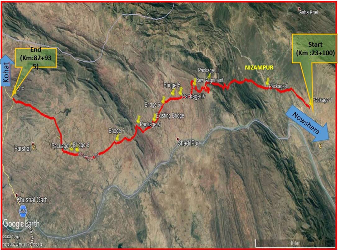 THE PROJECT IS LOCATED IN NOWSHERA AND KOHAT DICTRICT AND SERVES AS SHORTEST ROUTE CONNECTING TRAFFIC FROM DISTRICT SWABI, DISTRICT NOWSHERA, KAMRA AND ADJECENT AREAS TO DISTRICT KOHAT. TOTAL LENGTH OF PROJECT IS 58.42 KM AND STARTED IN SEPTEMBER 2015. PROJECT IS DELAYED DUE TO SEVERAL REASONS INCLUDING SHORTAGE OF FUNDS. UPTIL NOW PHYSICAL PROGRESS ACHIEVED IS 92% AND FINANCIAL PROGRESS IS 88.43%. PROJECT IS SUBDIVIDED INTO 6 PACKAGES OF WHICH PACKAGE 1,4 AND 5 ARE SUBTANTIALLY COMPLETED, PACKAGE 6 IS COMPLETED, WHILE PACKAGE 2 AND 3 ARE IN PROGRESS.A TOTAL AMOUNT OF RS 2139.12 Million(2468.07 Million including escalation ) IS CERTIFIED TO THE CONTRACTOR AGAINST REVISED TS COST OF RS 3075.94 Million. CONTRACTOR OF THE PTOJECT IS M/s Khattak Allied Construction Co. (Package I-V), M/s Aman Ullah Khan & Co. (Package-VI) AND CONSULTANT IS M/s NESPAK Pvt. LTD